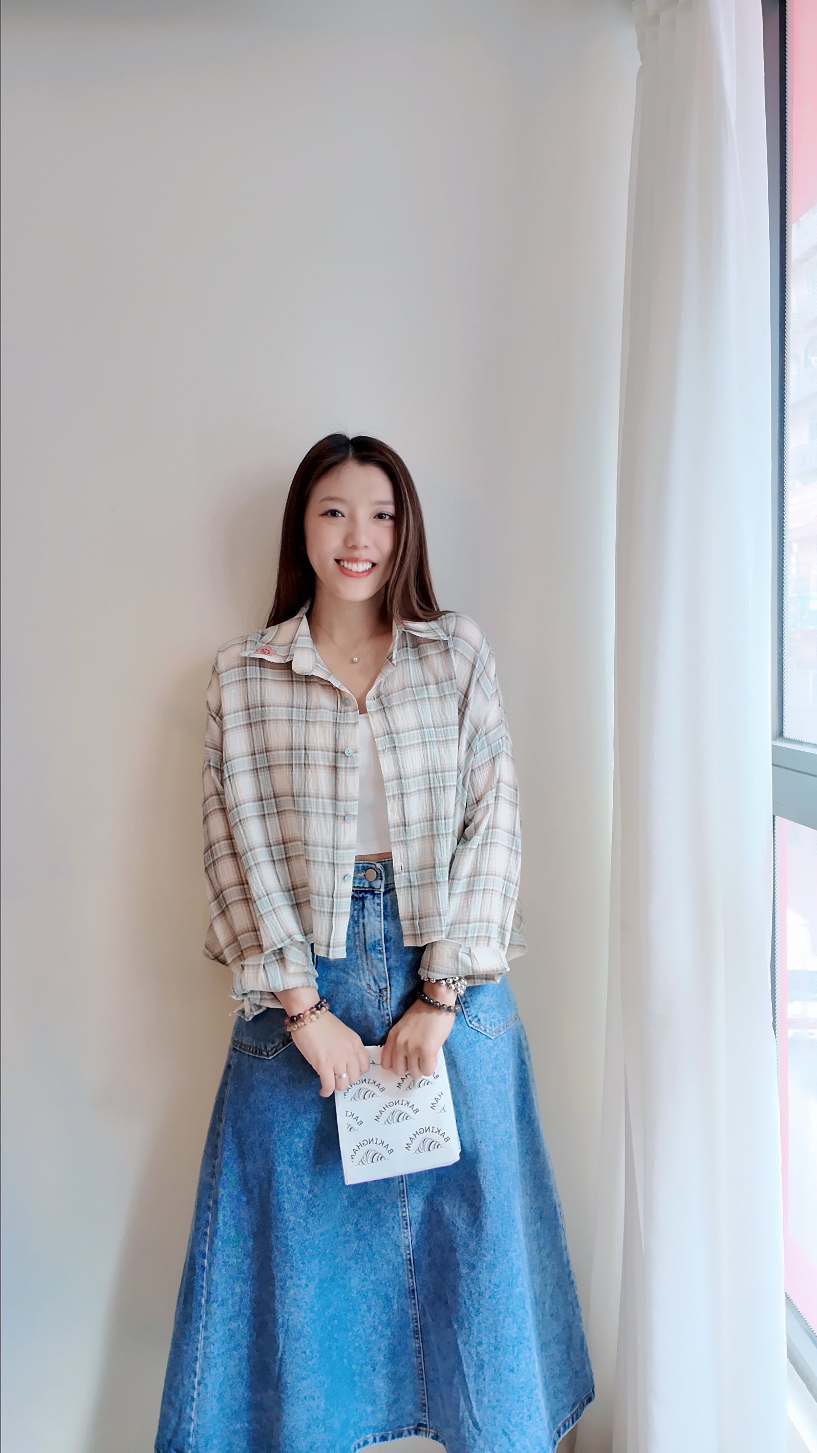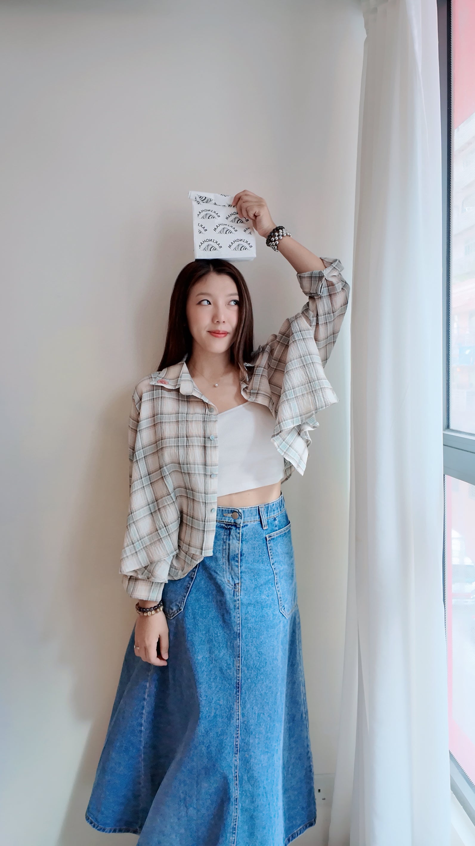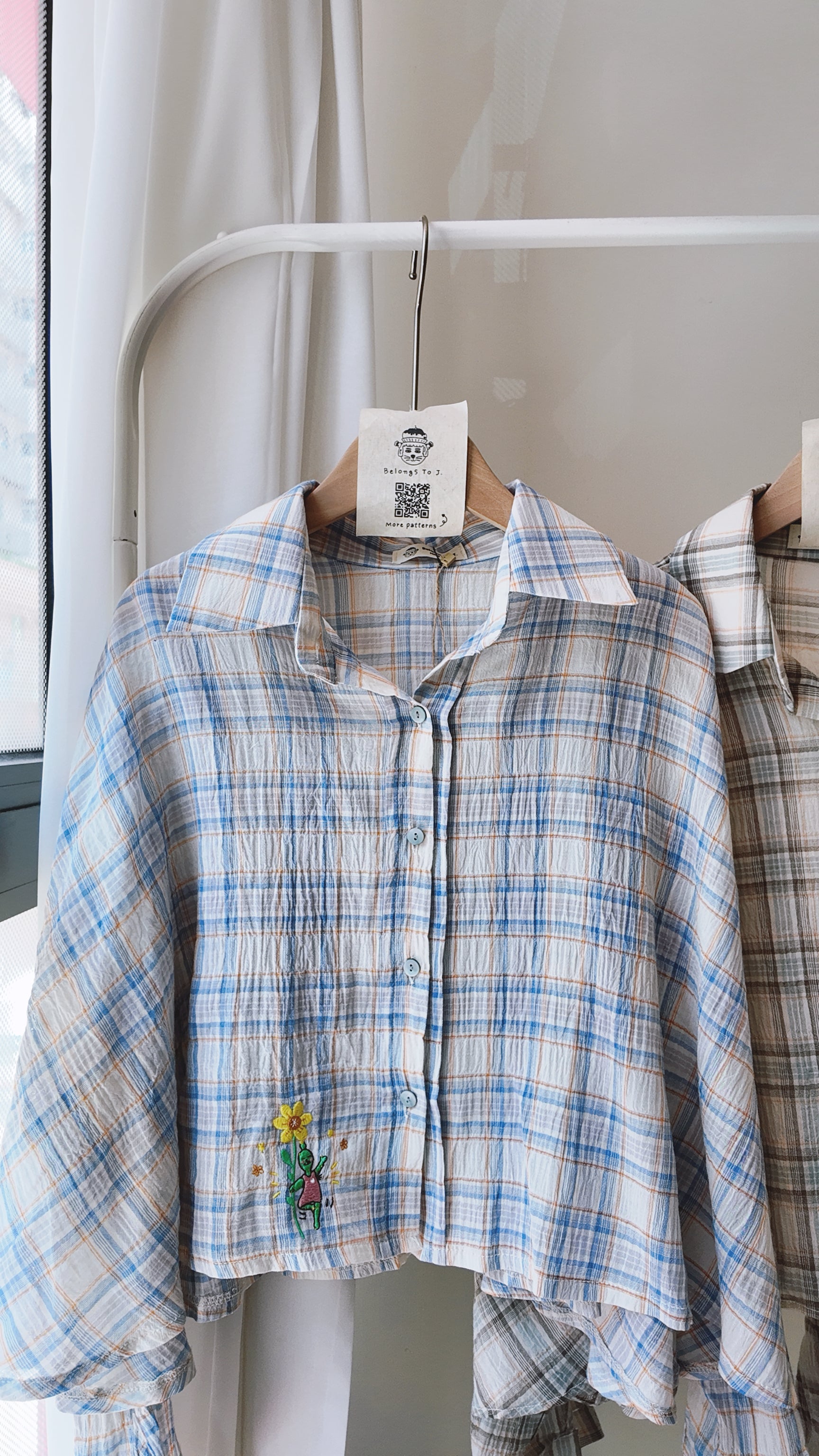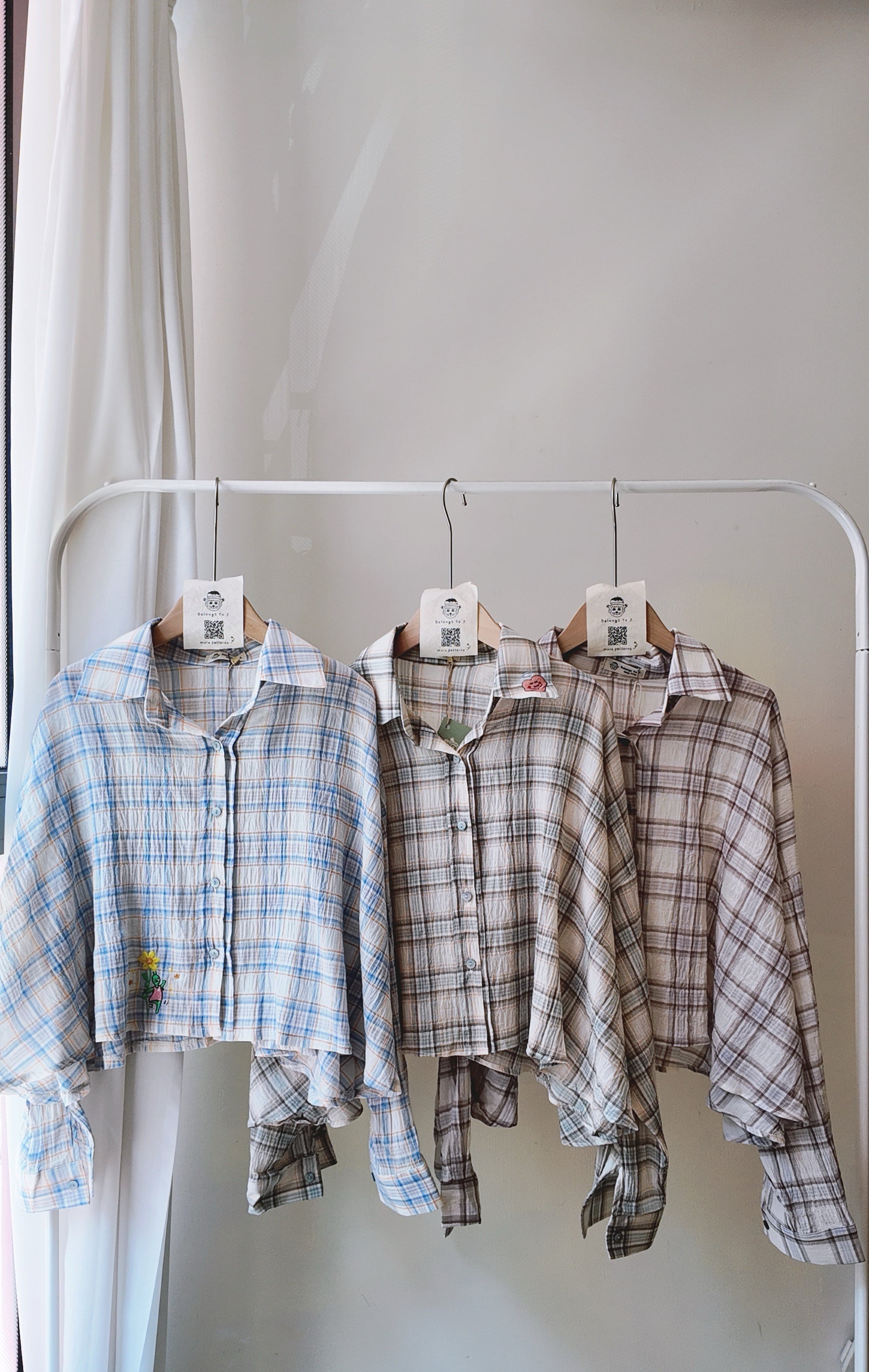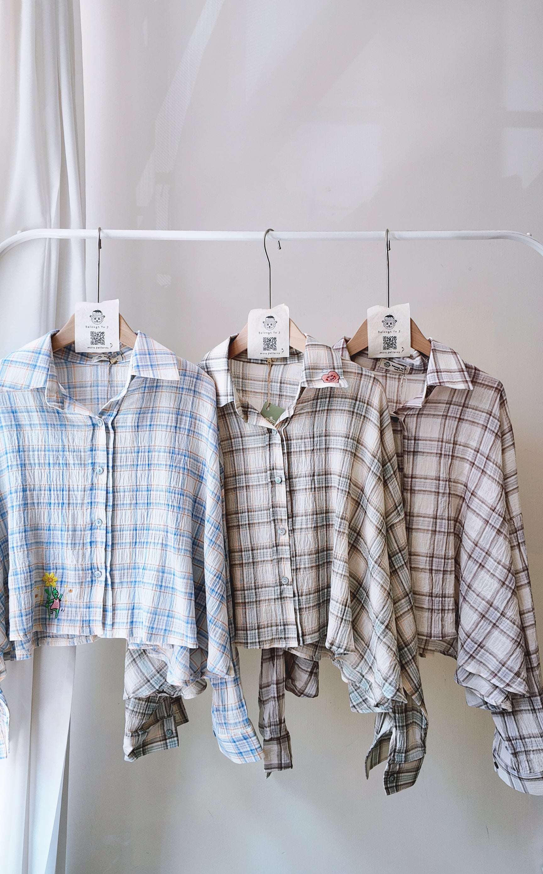 落肩拼色格仔長袖襯衫