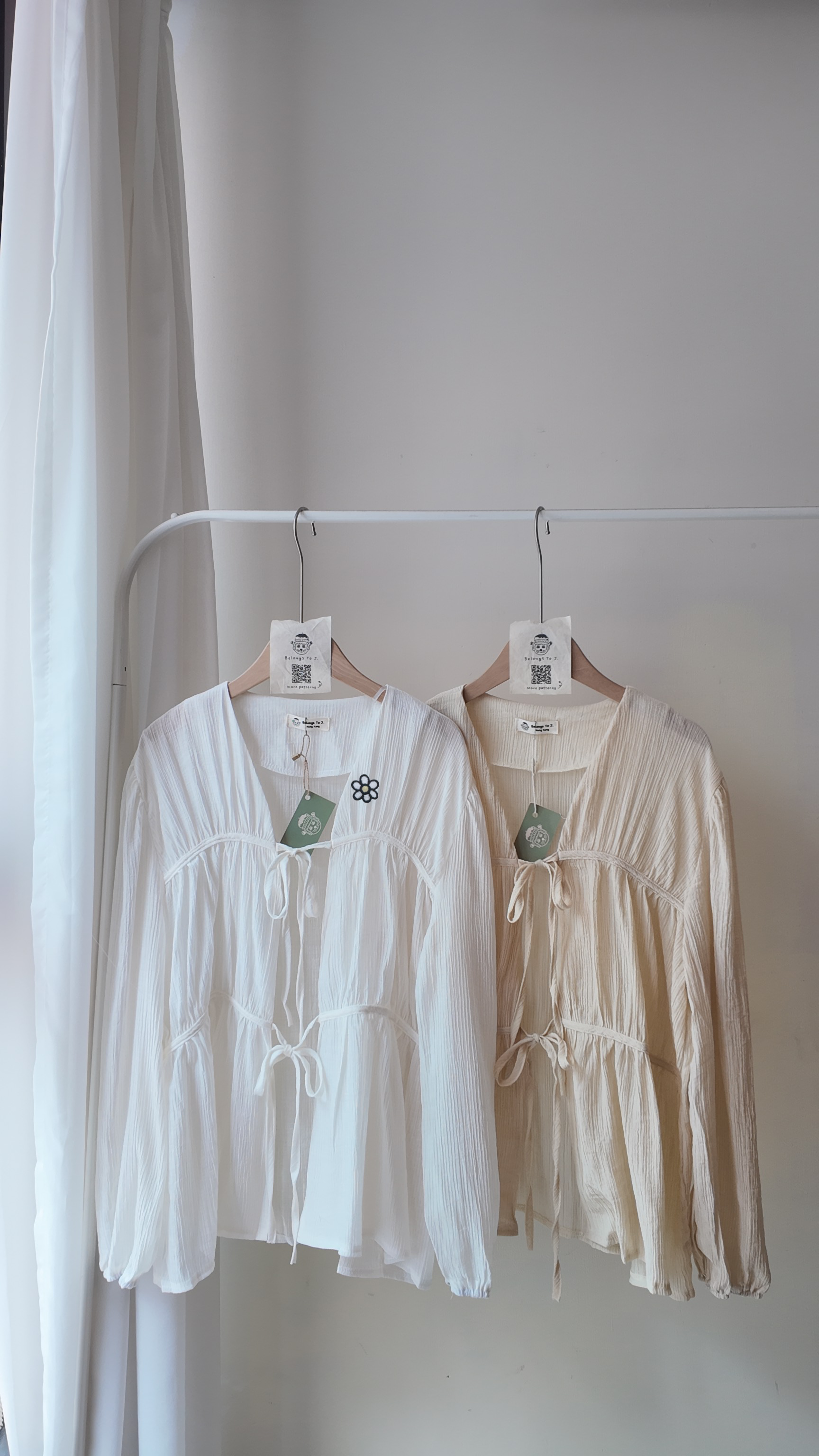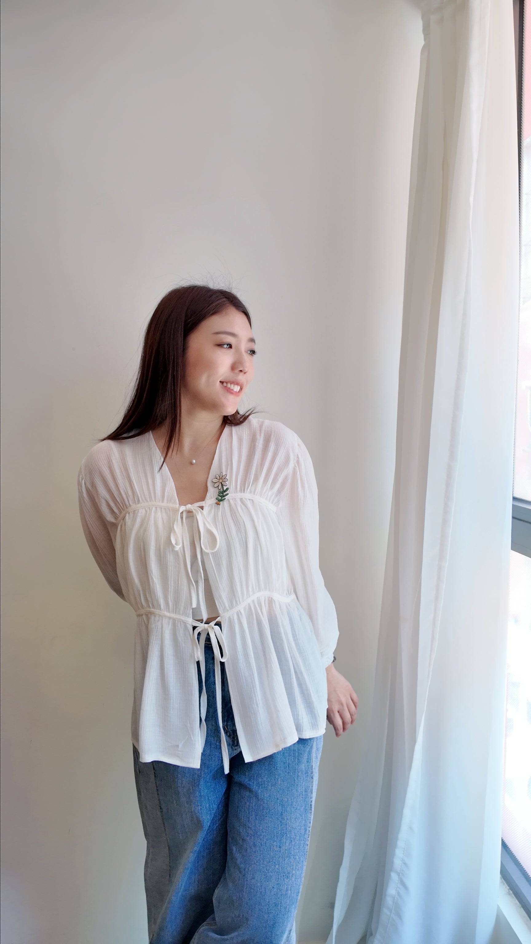 雙綁帶皺皺泡泡袖長袖罩衫